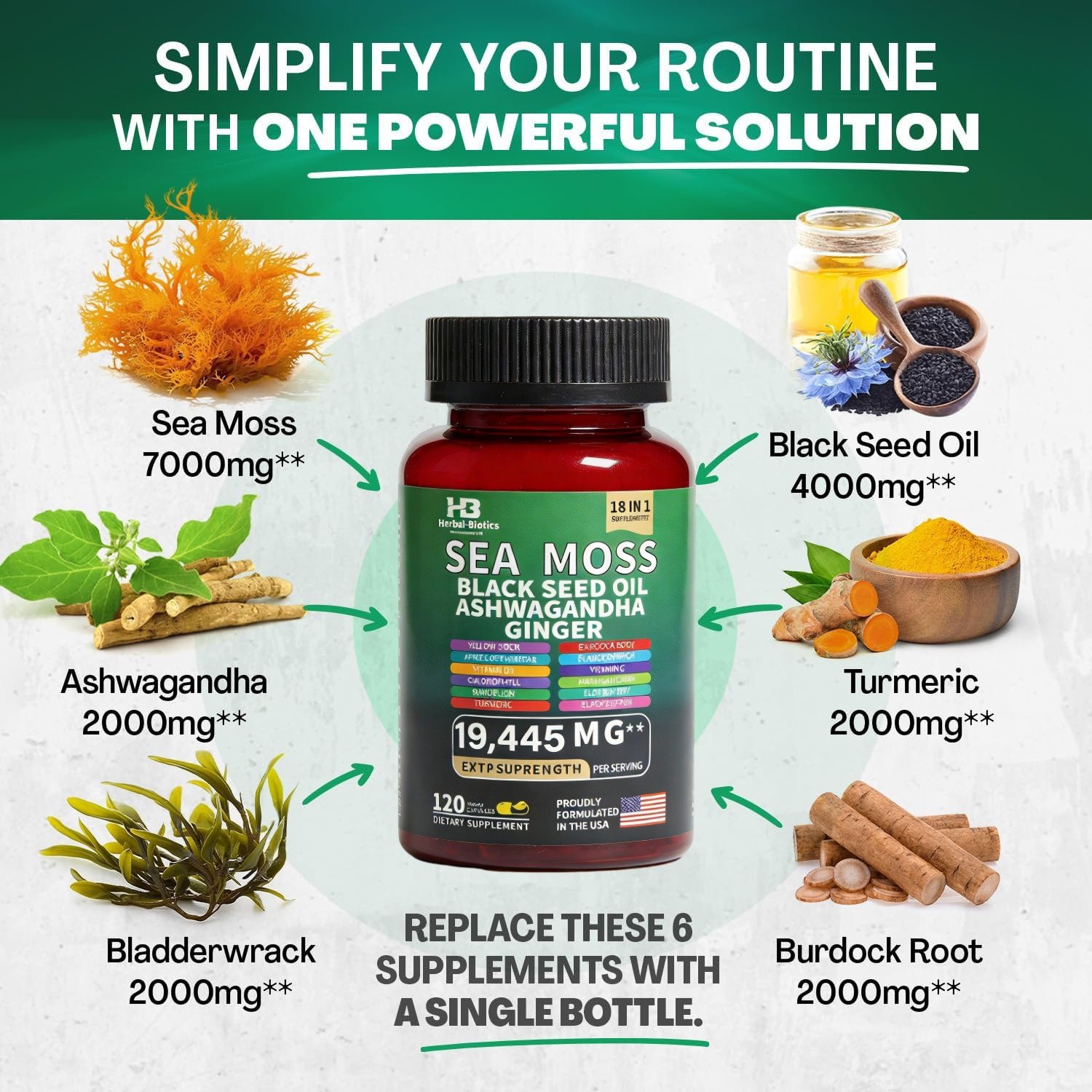 :sparkles: Product OverviewExperience the power of nature in one advanced daily formula. Our 18-in-1 Sea Moss Complex combines potent herbal extracts, essential vitamins, and time-tested botanicals to support immunity, energy, digestion, and overall vitality — all in convenient capsules.Crafted with premium ingredients and formulated in the USA, this powerful blend delivers concentrated extracts equivalent to 19,445 mg per serving for maximum effectiveness.